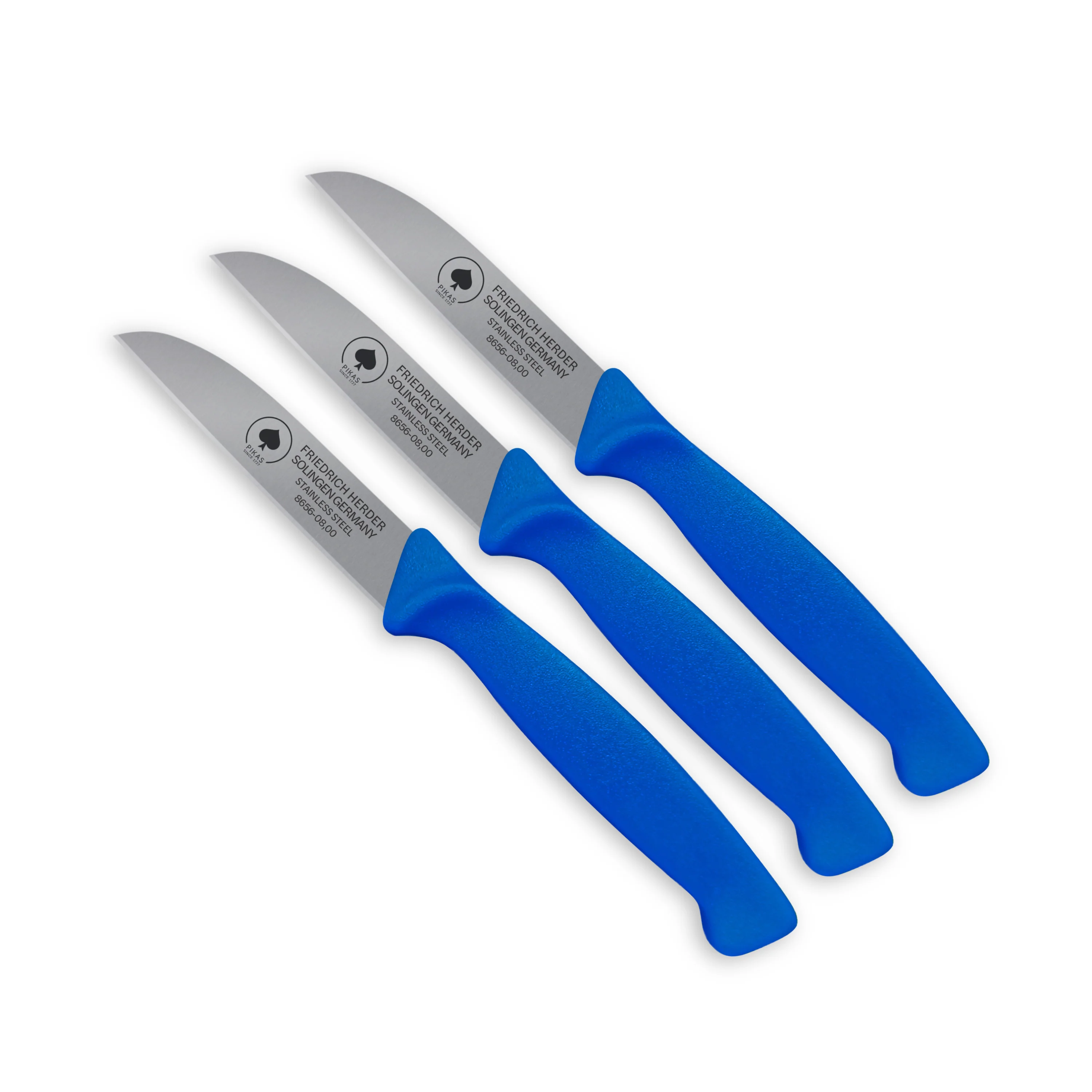 Küchenmesser-Klassiker im praktischen 3er Set! Die kurze gerade Klinge eignet sich perfekt zum Zerkleinern, Dekorieren und Säubern von Obst und Gemüse. Rostfrei, Dünnschliff. Extreme Schärfe und Schnitthaltigkeit. Kunststoffgriff sorgt für bequeme Handhabung. Qualität aus Solingen, direkt vom Hersteller.